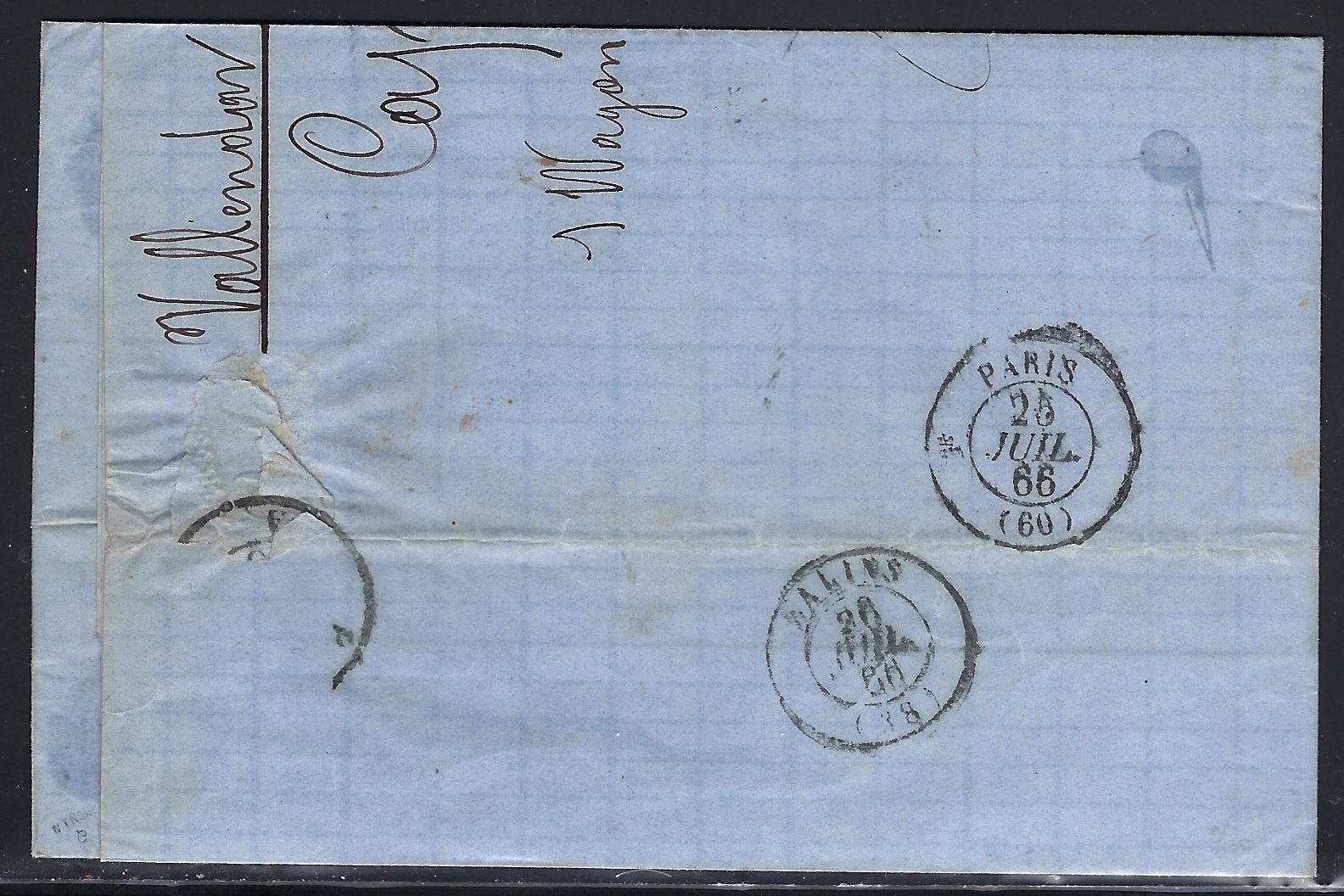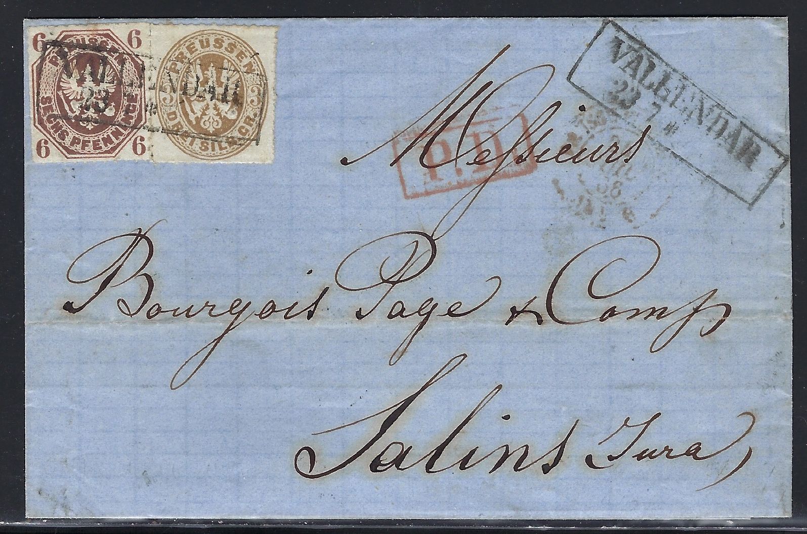 Preußen Mi 15+18 auf Auslandsbrief nach Frankreich als MiF mit Ra2 Vallendar und PD in rot nach Salins Jura