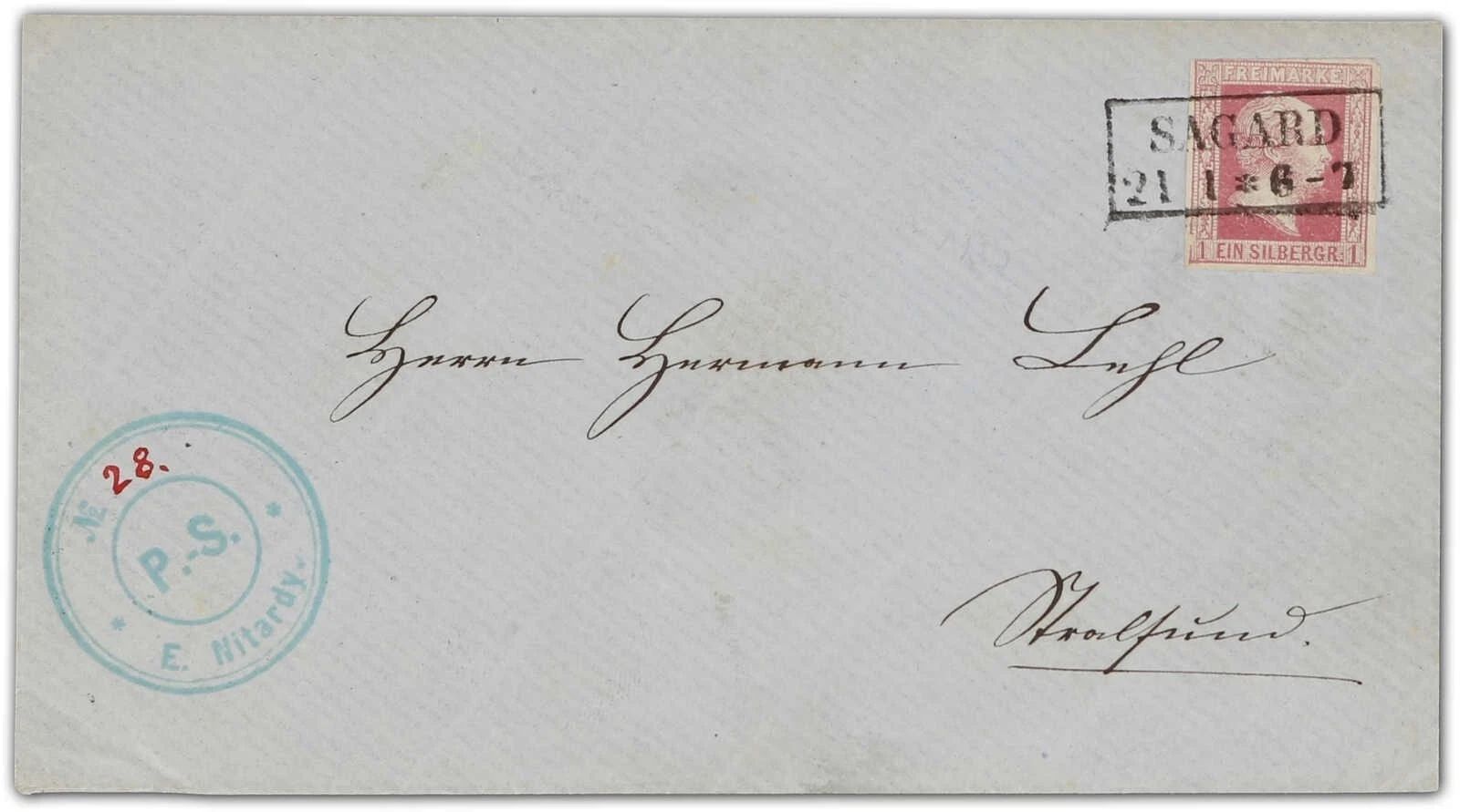 Dreiseitig vollrandig auf sauberem Brief mit Ra2 "SAGARD 21 1", links oben etwas berührt, rückseitig intaktes rotes Lacksiegel, auf Brief noch unbekannt und im Michel Spezial nur als gestempelt gelistet, ME für gestempelt bereits 750€. Sehr gute Qualität
