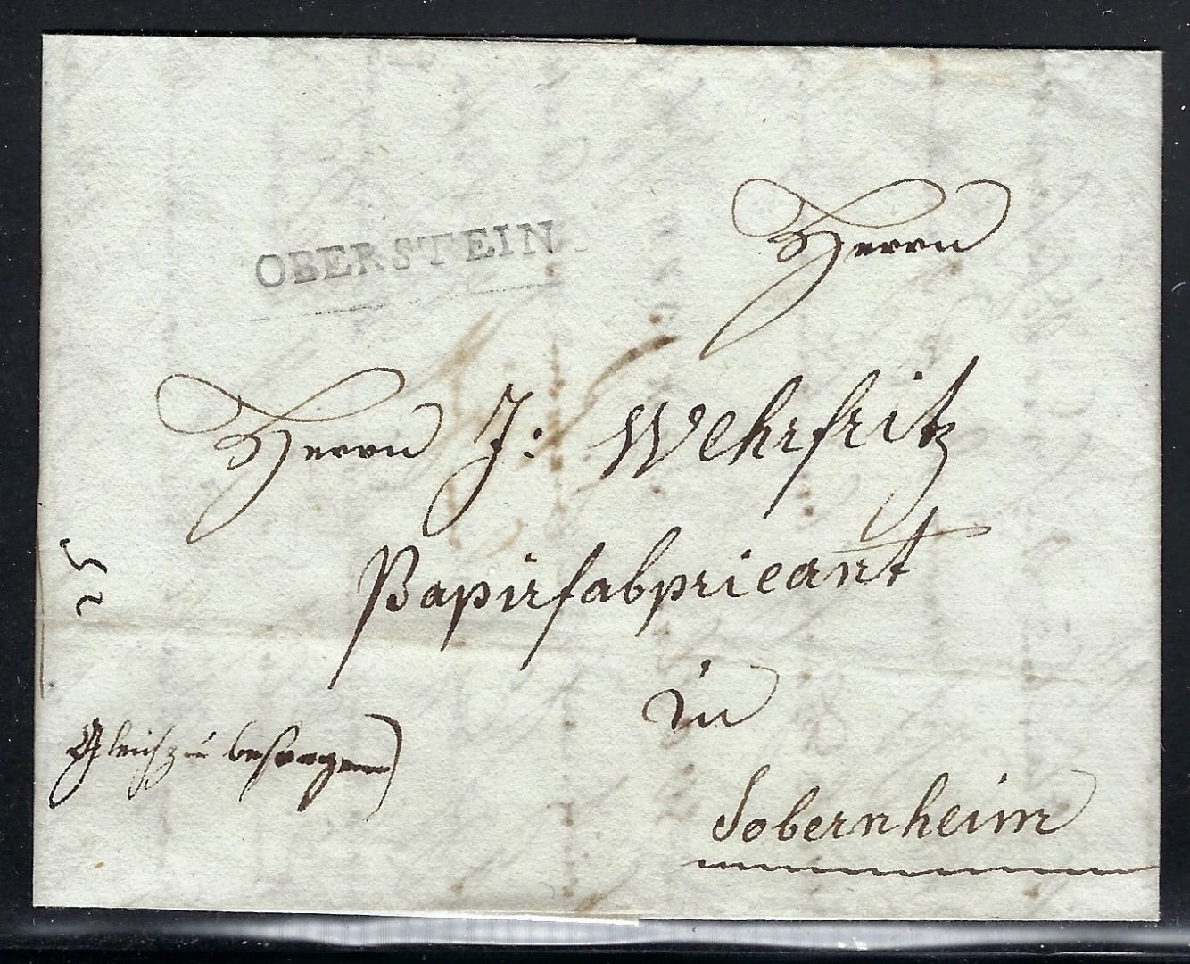 Geschäaftsbrief aus Obersteinan den Papierfabrikant Wehrfritz in Sobernheim. Vorderseitig mit L1 Oberstein und handschriftl. Vermerk "Gleich zu besorgen"