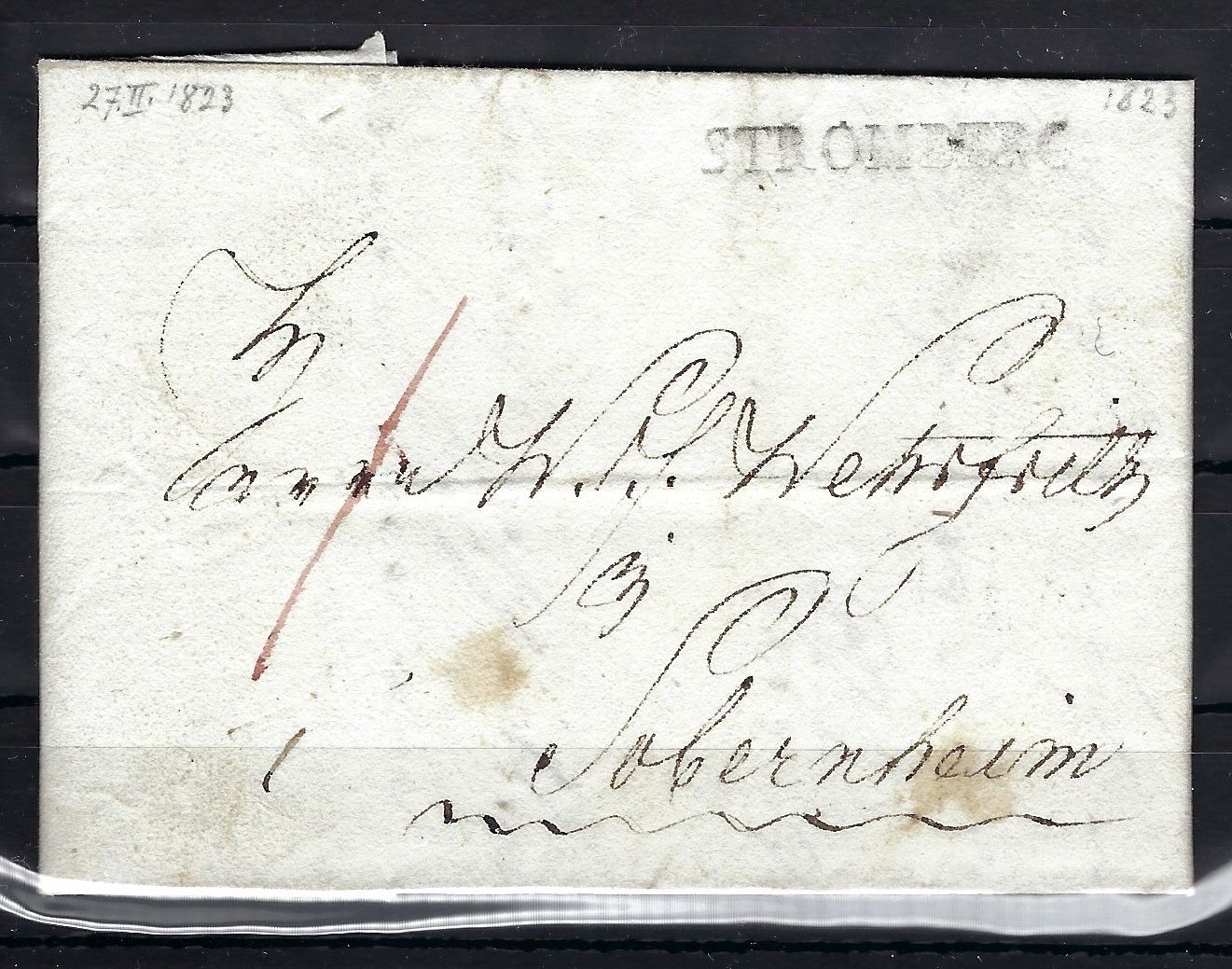 Preußen Vorphila 1823, Faltbrief mit L1 Stromberg über Creuznach (rückseitig L2) n. Sobernheim