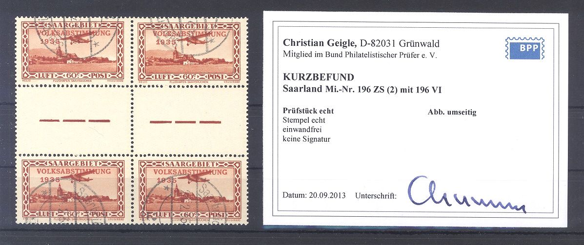 Saargebiet Michel Nummer 196, die 60 Pfg. Freimarke zur Volkabstimmung in einer Einheit als zwei Zwischenstegpaare gestempelt mit auch einem Plattenfehler. Eine schöne Einheit. Es liegt ein Kurzbefund BPP vor, ist mit eingescannt.