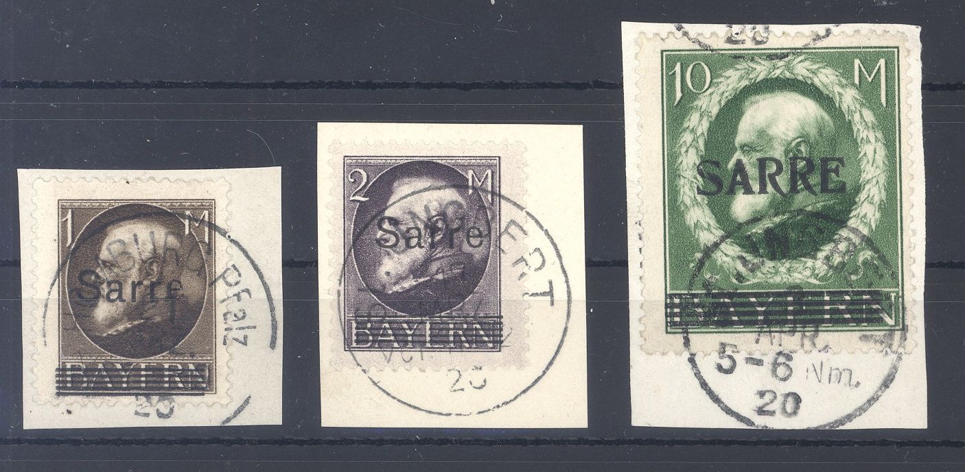 Saargebiet Michel Nummer 27, 28 und 31 aus Sarre Freimarken 1920 gestempelt auf Briefstücken. Jeder Wert ist geprüft.