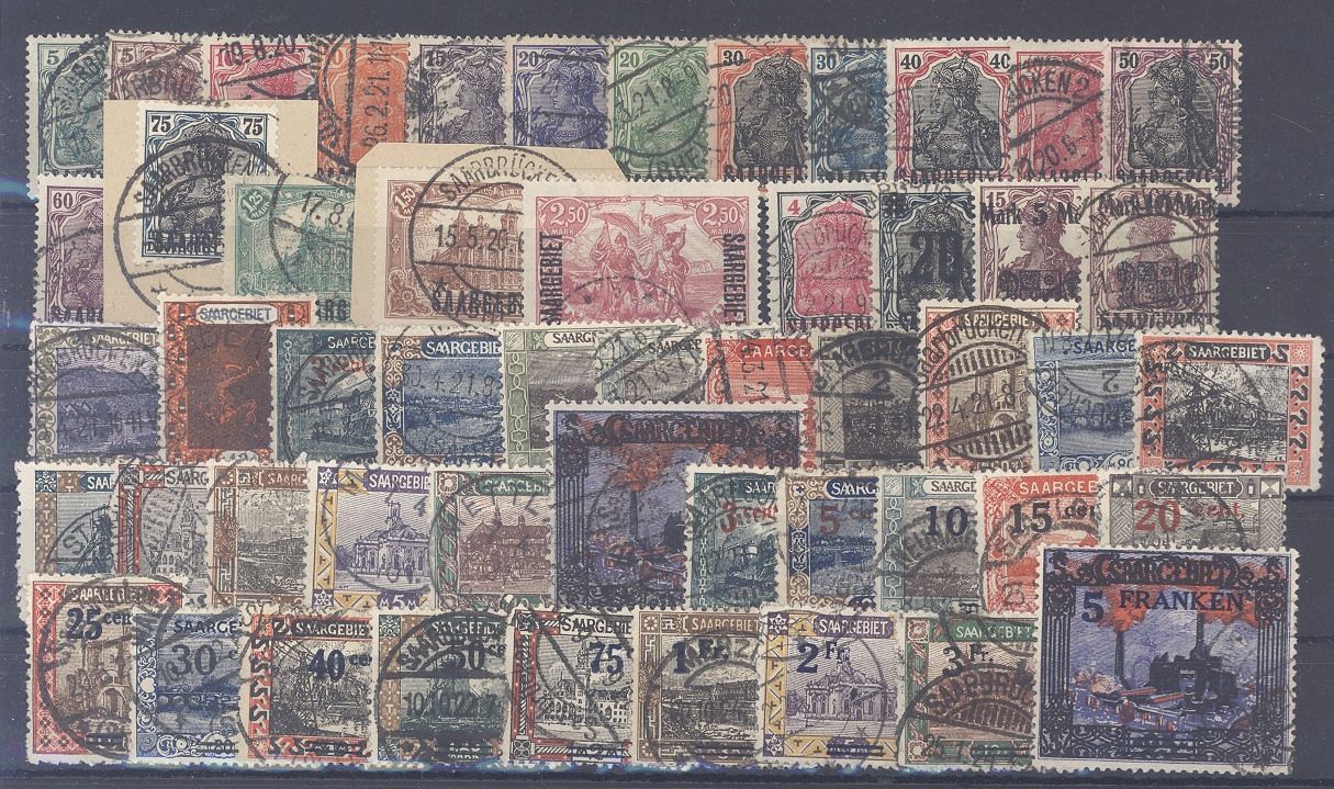 Saargebiet Michel Nummer 332/83 aus Freimarken 1920/22 fast nur gestempelt. Die Michel Nummer 357 ist ungebraucht (*) und unberechnet, der Rest ist gestempelt.