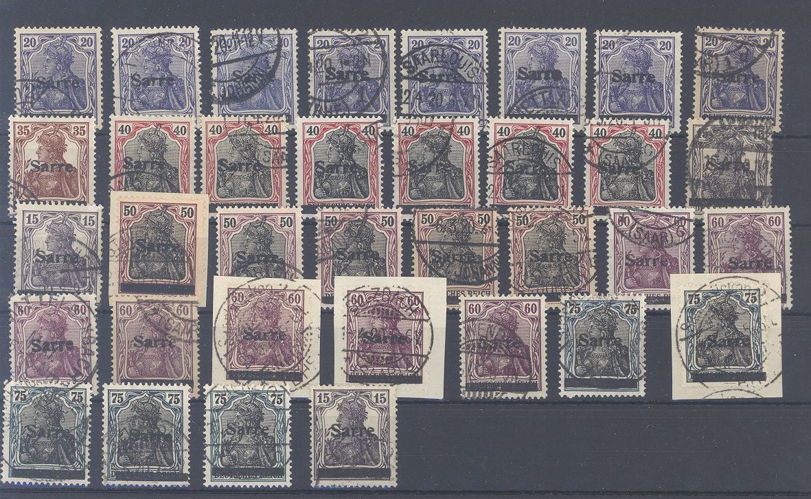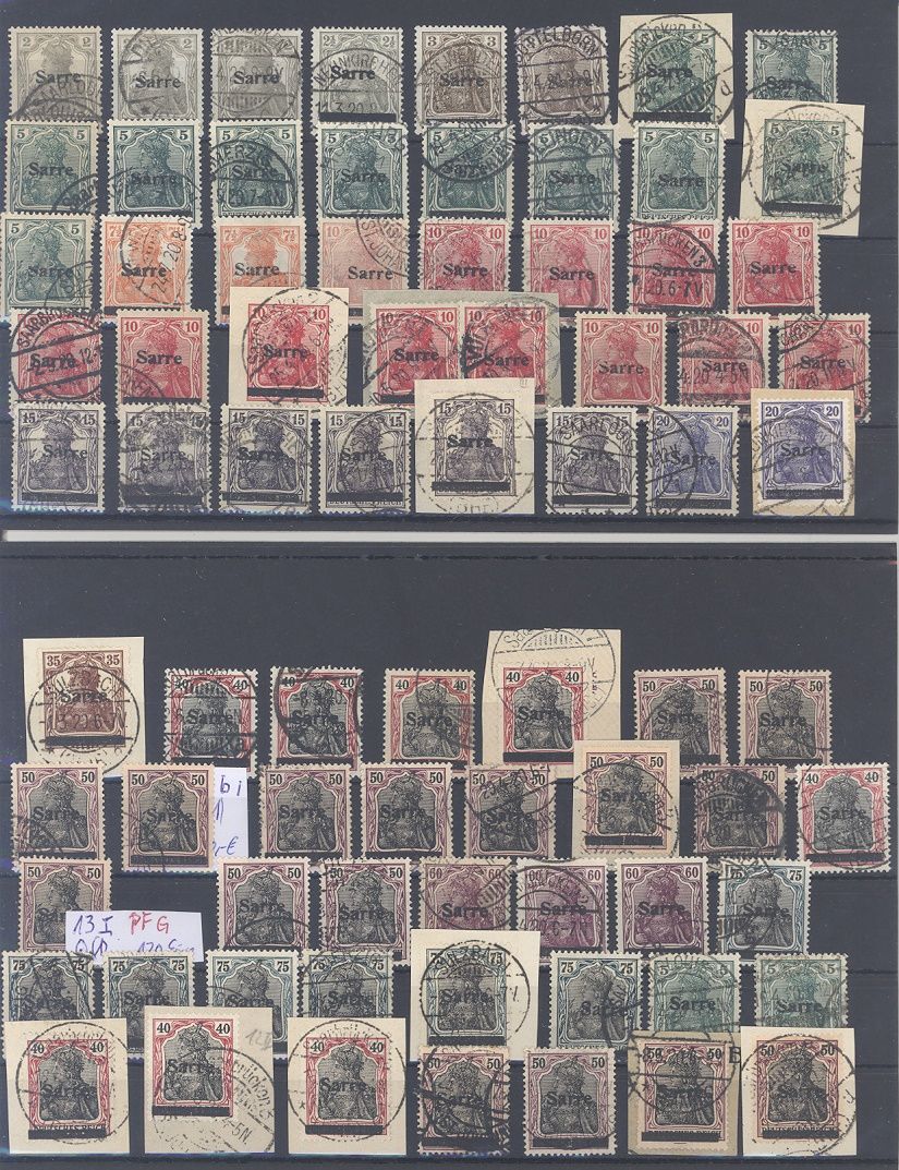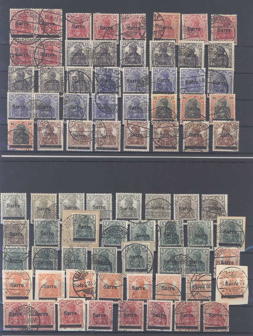 Saargebiet, umfangreicher gestempelter Sarre Ausgaben auf fünf Steckkarten, einfach zusammengesteckt aus einem teuren Spezialbestand. Dabei Einheiten und viele Briefstücke, sollte ein nette kleine Fundgrube hinsichtlich Typen, Farben Plattenfehlern,...sein...