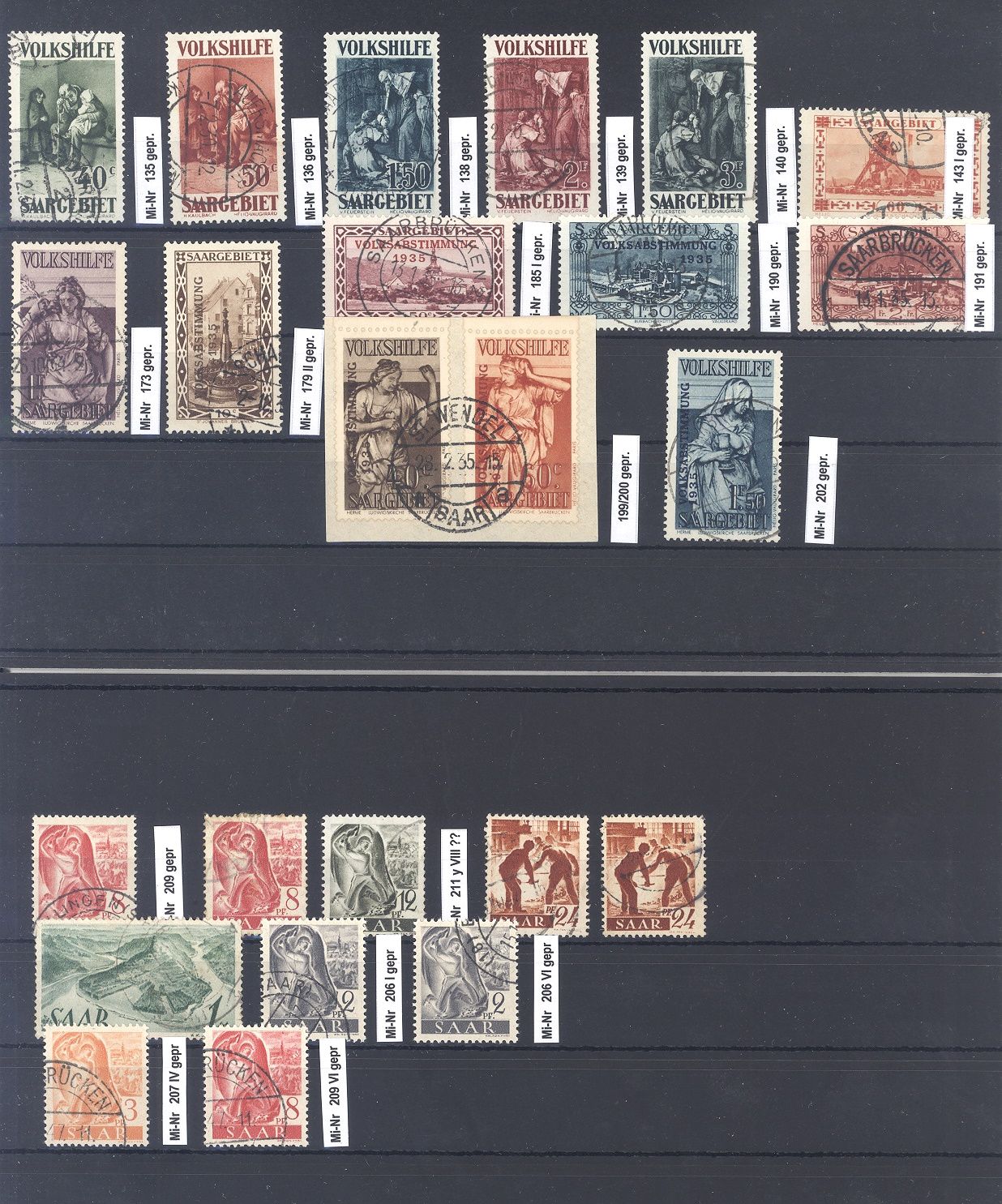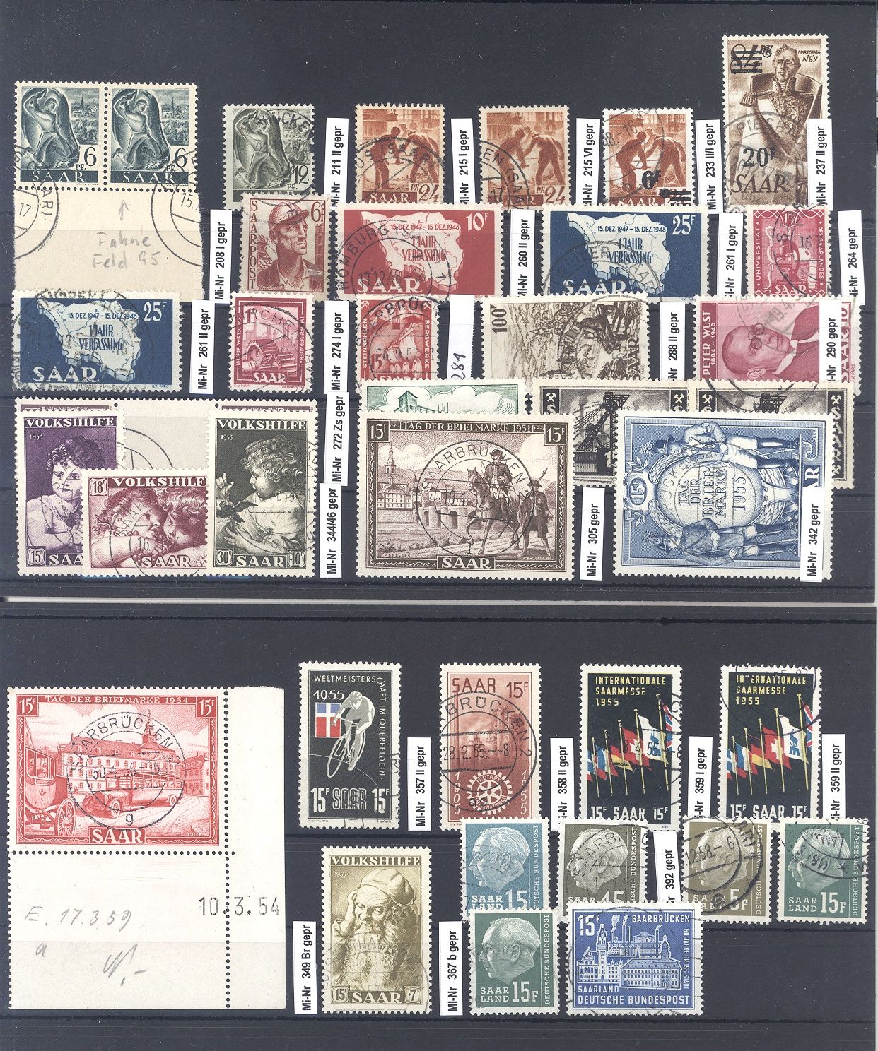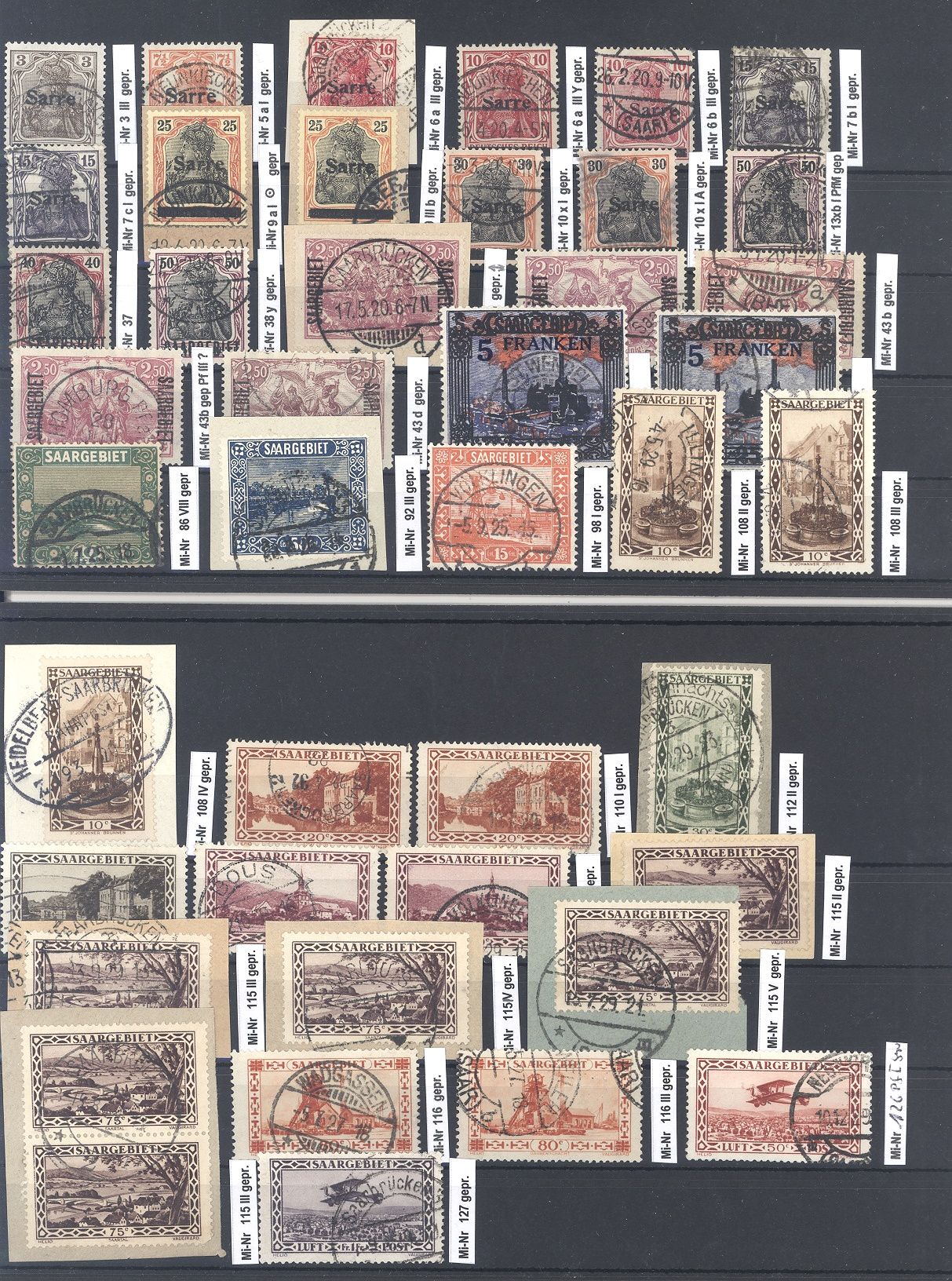 Saargebiet und Saarland, umfangreicher gestempelter Posten Sarre Ausgaben auf zwei Steckkarten, allermeist geprüft auf zwei Steckkarten. Bereits die Prüfgebühren haben so einiges gekostet