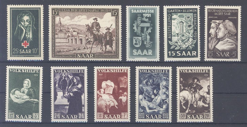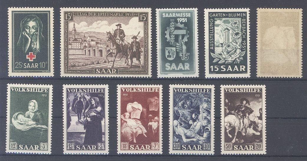 Saarland Michel Nummer 304/13, Jahrgang 1951 **/*, allermeist **. Die billige Michel Nummer 307 ist ungebraucht * und unberechnet, die anderen Werte sind **.
