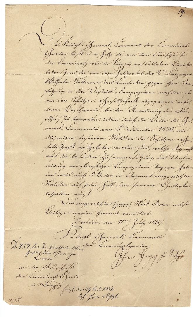 Königl. General-Commando der Communalgarden Johann Herzog zu Sachsen, später ab den 11.8.1854 König von Sachsen. Selten !