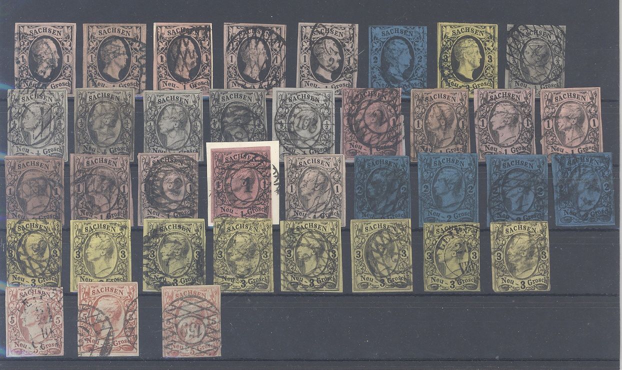 Sachsen, gestempelter Posten aus Michel Nummer 2/12, Freimarken 1851/63 auf Steckkarte. Stets billigste Farben und Typen gerechnet.