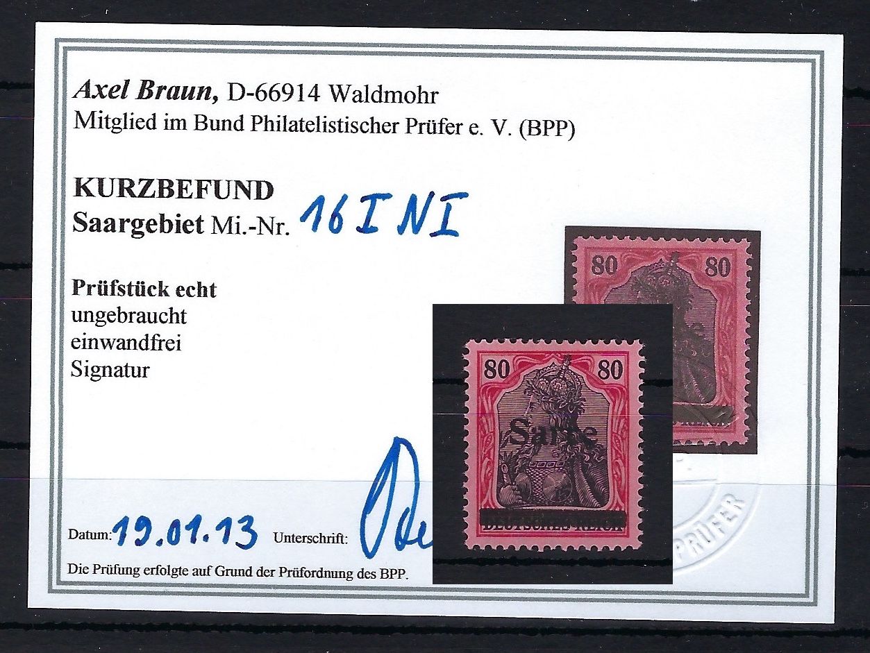 Sarre 16 I N I *, einwandfrei, Originalgummi, KB Braun BPP
