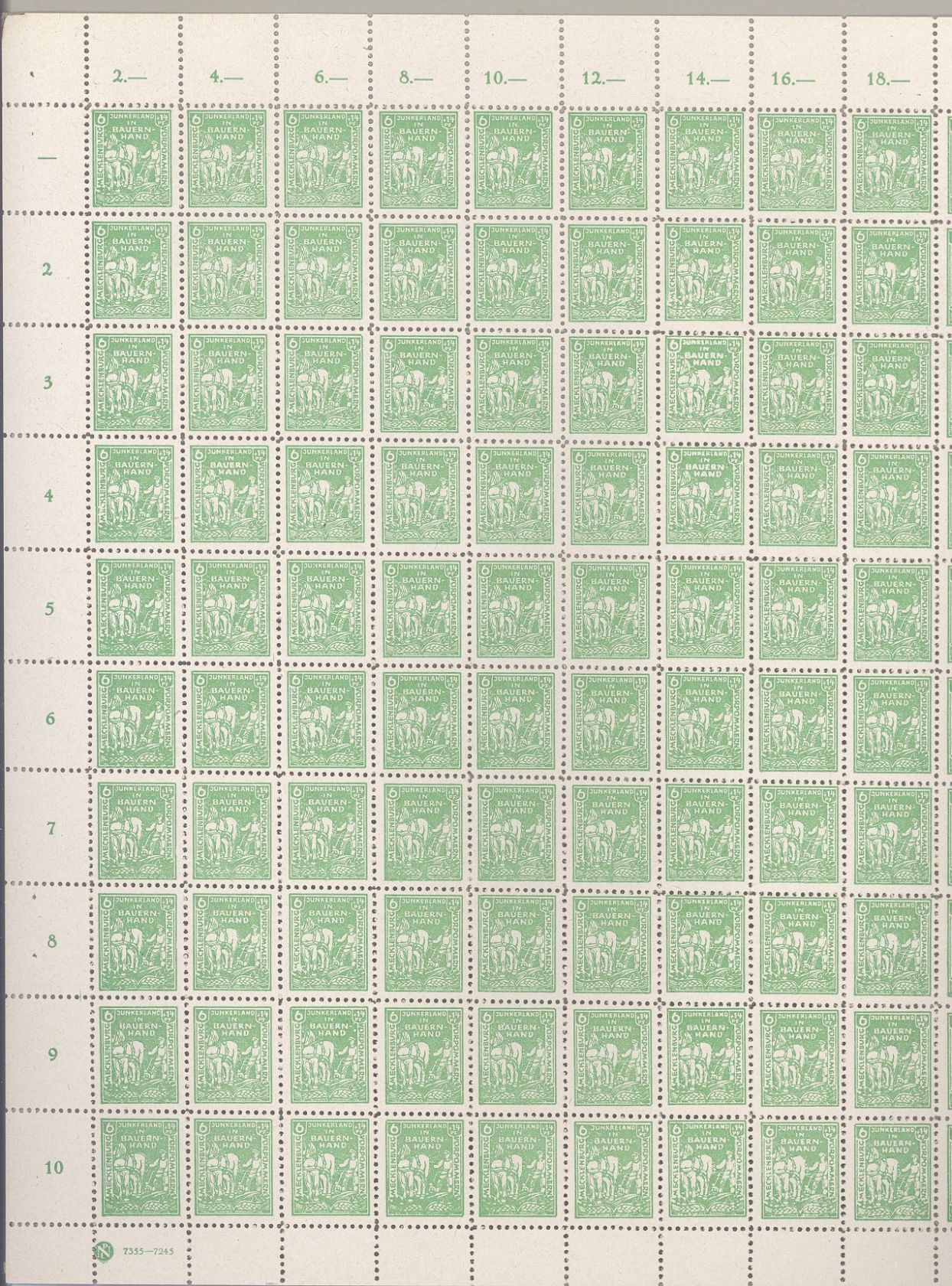 SBZ, ** Bogen der Michel Nummer 23, 6 Pfg. Bodenreform 1945 in bis auf zwei kleine Fleckchen in sehr guter Erhaltung mit den Plattenfehlern I-XIX und einem Druckvermerk. Interessante Ergänzung zur Sammlung!