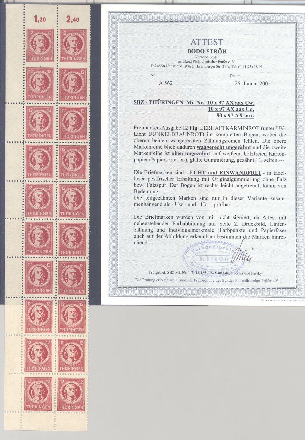SBZ, interessanter Bogenteil mit Michel Nummer 97 AX mit Teilzähnungen **. Es liegt ein FA BPP vom komplettem Bogen vor, ist mit eingescannt, hat bereits einiges gekostet, interessant!