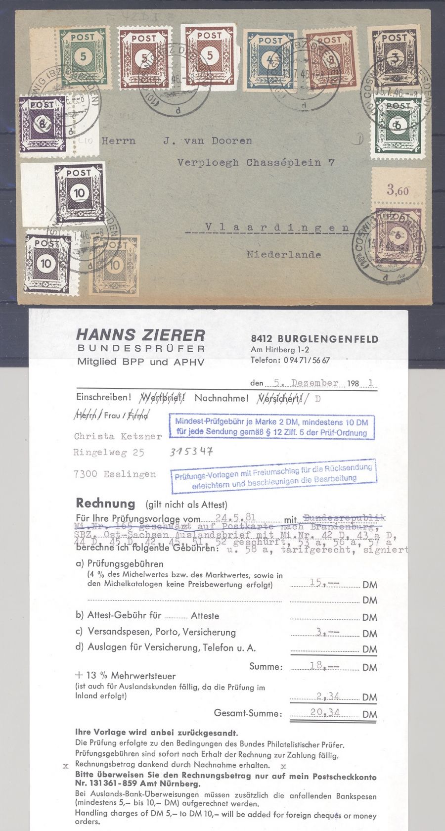 SBZ, interessanter Brief, frankiert mit umfangreicher Ziffern MiF aus Coswig gelaufen, der Brief ist rückseitig geprüft BPP. Es liegt zudem eine alte Zierer Rechnung mit dabei, ist mit eingescannt.
