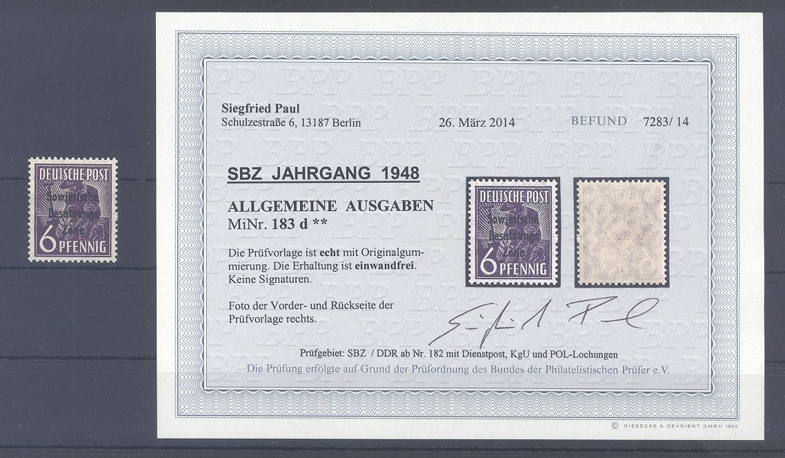SBZ Michel Nummer 183d, 6 Pfg. Freimarke 1948 in der guten Farbe d **, ein sehr schöner Wert. Es liegt ein Befund BPP vor, hat bereits einiges gekostet, ist mit eingescannt.