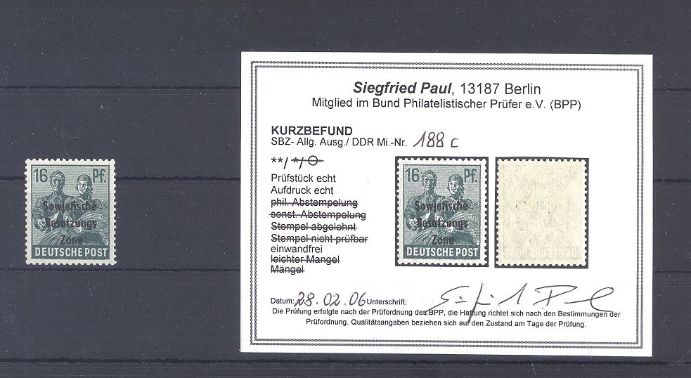 SBZ Michel Nummer 188c, 16 Pfg, Freimarke 1948 in der guten Farbe c **. Es liegt ein Kurzbefund BPP vor, hat bereits einiges gekostet, ist mit eingescannt.