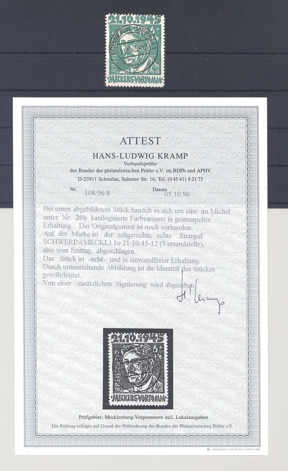 SBZ Mi.Nr. 20b, 6 Pfg. Opfer des Faschismus 1945 in der besseren Farbe b gestempelt, ein sehr schöner Wert. Es liegt ein FA BPP vor, hat bereits einiges gekostet, ist mit eingescannt.