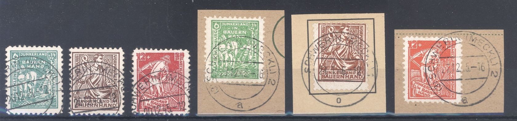 SBZ Michel Nummer 23/25 a+b, Bodenreform 1945 gestempelt mit auch drei Briefstücken. Jeder Wert ist geprüft BPP.