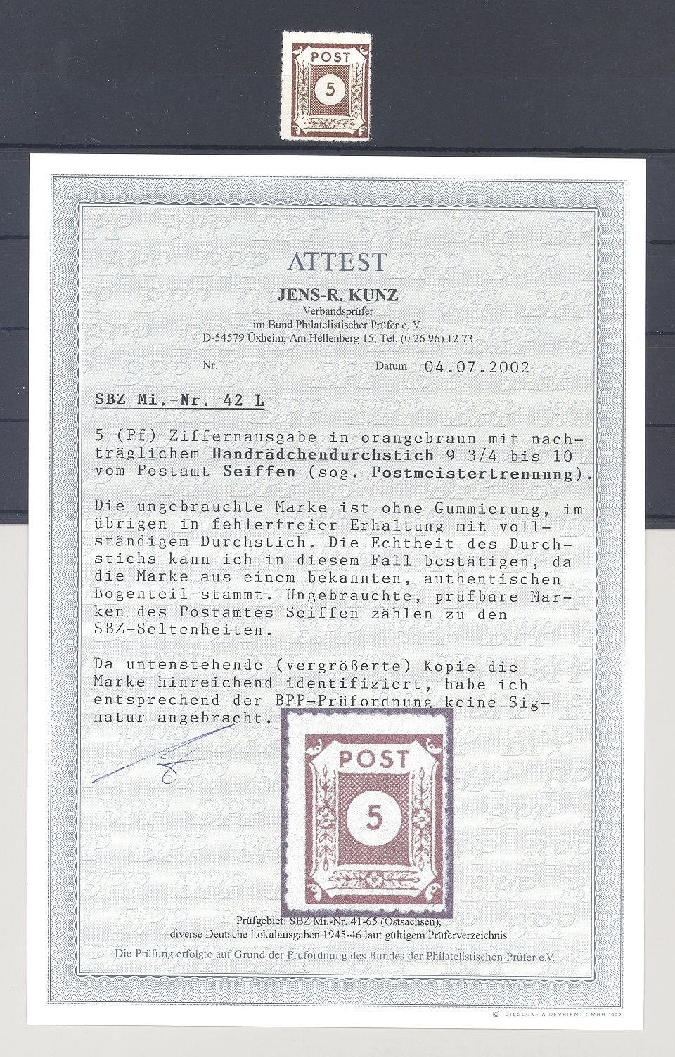 SBZ Michel Nummer 42 L, die 5 Pfg. Freimarke mit der Seiffen Postmeistertrennung ungebraucht (*), ein sehr schöner Wert. Es liegt ein FA BPP vor, ist mit eingescannt, hat bereits einiges gekostet, wie im FA auch angegeben selten einmal angeboten! Der Michel für ** beträgt 1.000,00 Euro.