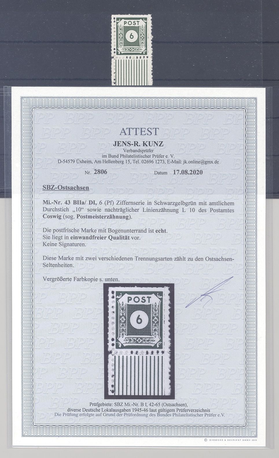 SBZ Michel Nummer 43 B IIa DI, 6 Pfg. mit guter Zähnung ** vom Unterrand. Es liegt ein FA BPP vor, hat bereits einiges gekostet, ist mit eingescannt, selten einmal angeboten!