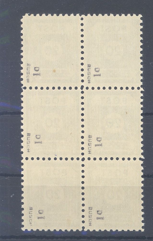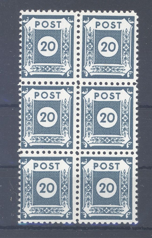 SBZ Michel Nummer 48 D I, 20 Pfg. Freimarke 1945 als ** Sechserblock mit einem Stockpunkt auf einer Marke, sonst ordentlich. Jeder Wert ist geprüft mit Altprüfung.