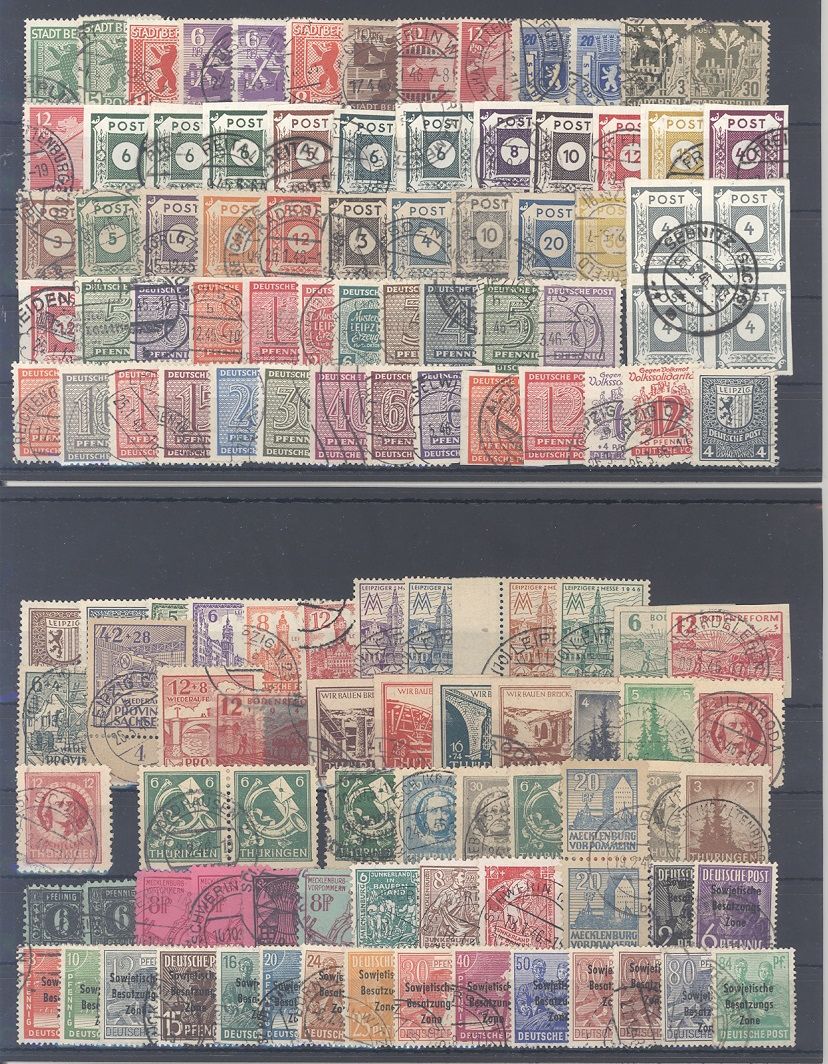 SBZ, umfangreicher gestempelter Posten mit auch einem Brief und drei Briefstücken auf fünf Steckkarten, einfach zusammengesteckt. Sollte bereits aufgrund der Materialfülle ein nettes Schnäppchen sein!