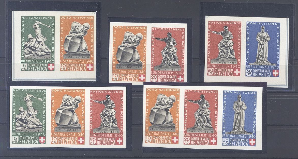 Schweiz, fünf verschiedene ** Zusammendrucke aus Block 5, Pro Patria 1940. Die losen Einzelmarken werten bereits mit 980,00 Euro, sehr nett!