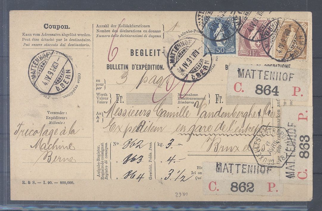 Schweiz, sehr dekorative Paketkarte aus dem Jahr 1891 frankiert mit Michel Nummer 92/94, Stehende Helvetia als MiF aus Mattenhof nach Belgien gelaufen. Sehr schöne Ergänzung zur Sammlung!