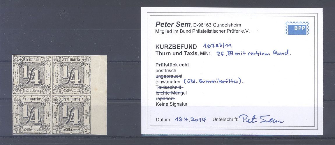 Thurn & Taxis Michel Nummer 26, 1/4 Silbergroschen Freimarke 1865 als ** Viererblock vom Seitenrand mit einem kleinen Stockpunkt am Rand und etwas bügig. Es gibt keinen Michel für ** Viererblöcke. Es liegt ein Befund BPP vor, hat bereits einiges gekostet, ist mit eingescannt, nette Ergänzung zur Sammlung!