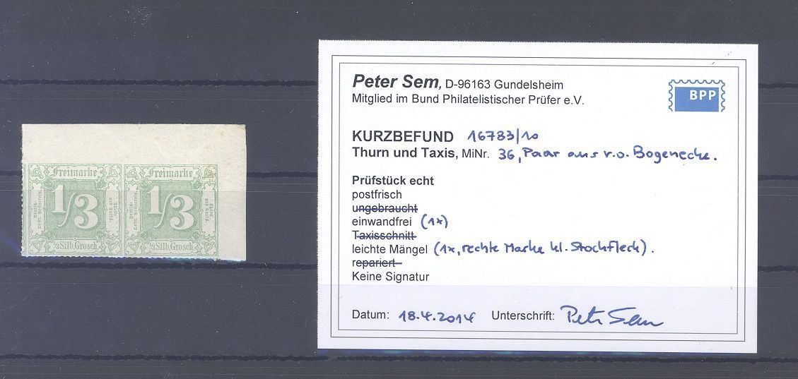Thurn & Taxis Michel Nummer 36, 1/3 Sgr. Freimarke 1865 als ** Paar vom Eckrand, eine Marke hat einen kleinen Stockfleck, sonst eine schöne Einheit. Es liegt ein Befund BPP vor, hat bereits einiges gekostet, ist mit eingescannt