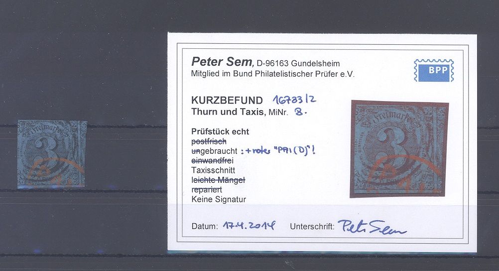 Thurn & Taxis Michel Nummer 8, 3 Kr. Freimarke 182 mit rotem Paid Stempel mit dem üblichen Schnitt. Es liegt ein Befund BBP vor, hat bereits einiges gekostet, ist mit eingescannt.