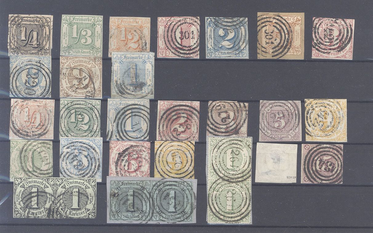 Thurn & Taxis, umfangreicher allermeist gestempelter Posten in wie üblich etwas unterschiedlicher Erhaltung, insgesamt doch ordentlicher auf Steckkarte, einfach zusammengesteckt, dabei auch drei Paare und die Michel Nummer 24 geprüft BPP. Dazu auch noch unberechnet eine Steckkarte mit ungebrauchten Werten, sollte ein nettes Schnäppchen sein.