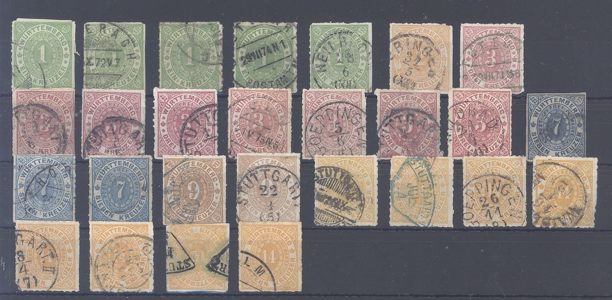 Württemberg, gestempelter Posten aus Michel Nummer 36/41, Freimarken 1869 in unterschiedlicher Erhaltung auf Steckkarte. Billigst!
