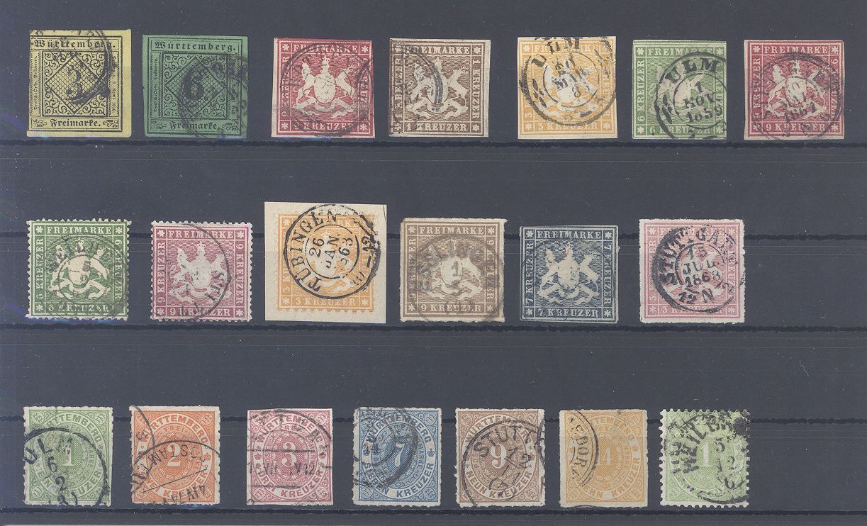 Württemberg, gestempelter Posten Kreuzer Werte auf Steckkarte, dabei auch die Michel Nummern 11/14, 18x, 19y und 36/41 vorhanden. Stets billigste Farben und Typen gerechnet.