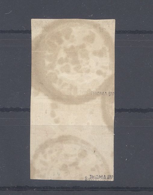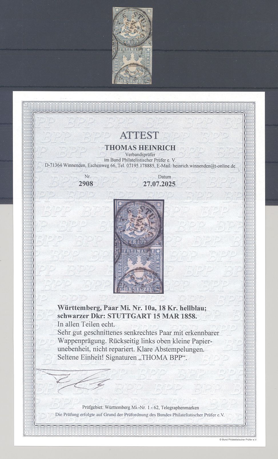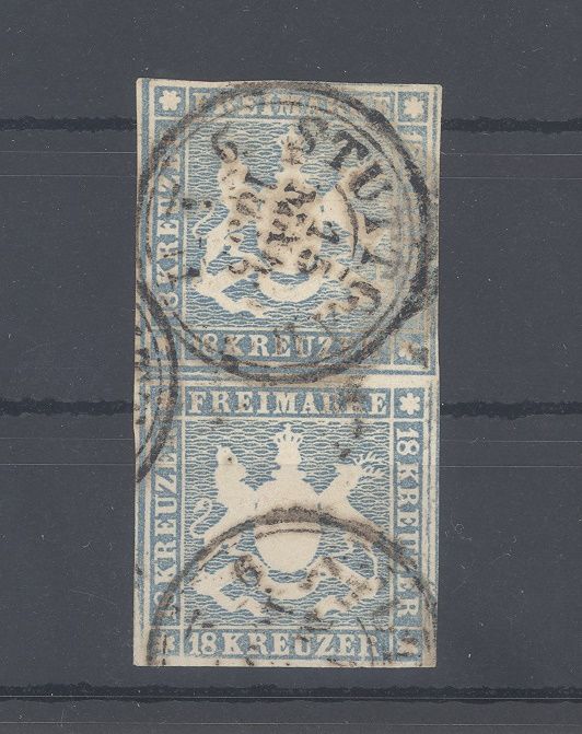 Württemberg Michel Nummer 10, 18 Kreuzer Freimarke 1857 als gestempeltes Paar mit einer ganz kleinen Einschränkung, sonst eine sehr schöne und auch ursprüngliche Einheit. Es liegt ein FA BPP vor, hat bereits einiges gekostet, ist mit eingescannt, als Einheit eine echte Seltenheit!
