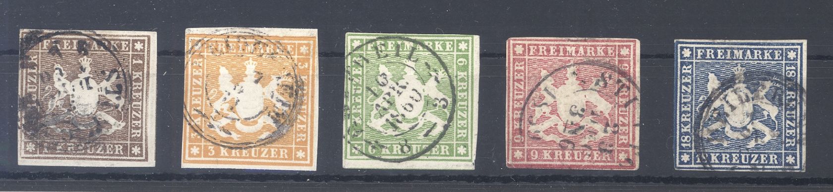 Württemberg Michel Nummer 11/15, Freimarken 1857 gestempelt. Fast jeder Wert ist geprüft.