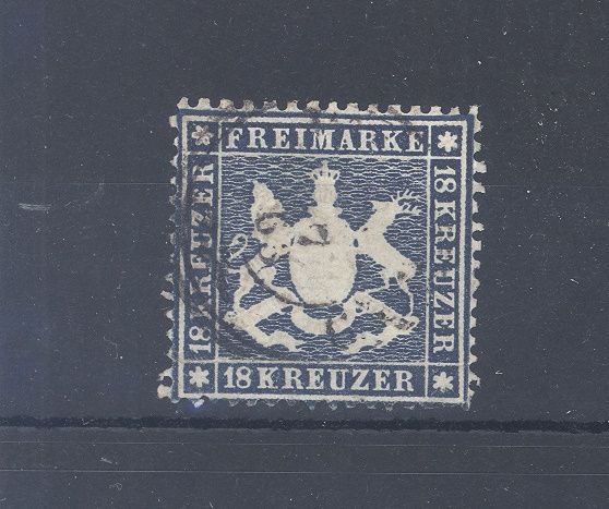 Württemberg Michel Nummer 20y, 18 Kreuzer Freimarken 1861 gestempelt einer reparierten Ecke, sonst ein ordentlicher Wert. Der Wert ist geprüft BPP.