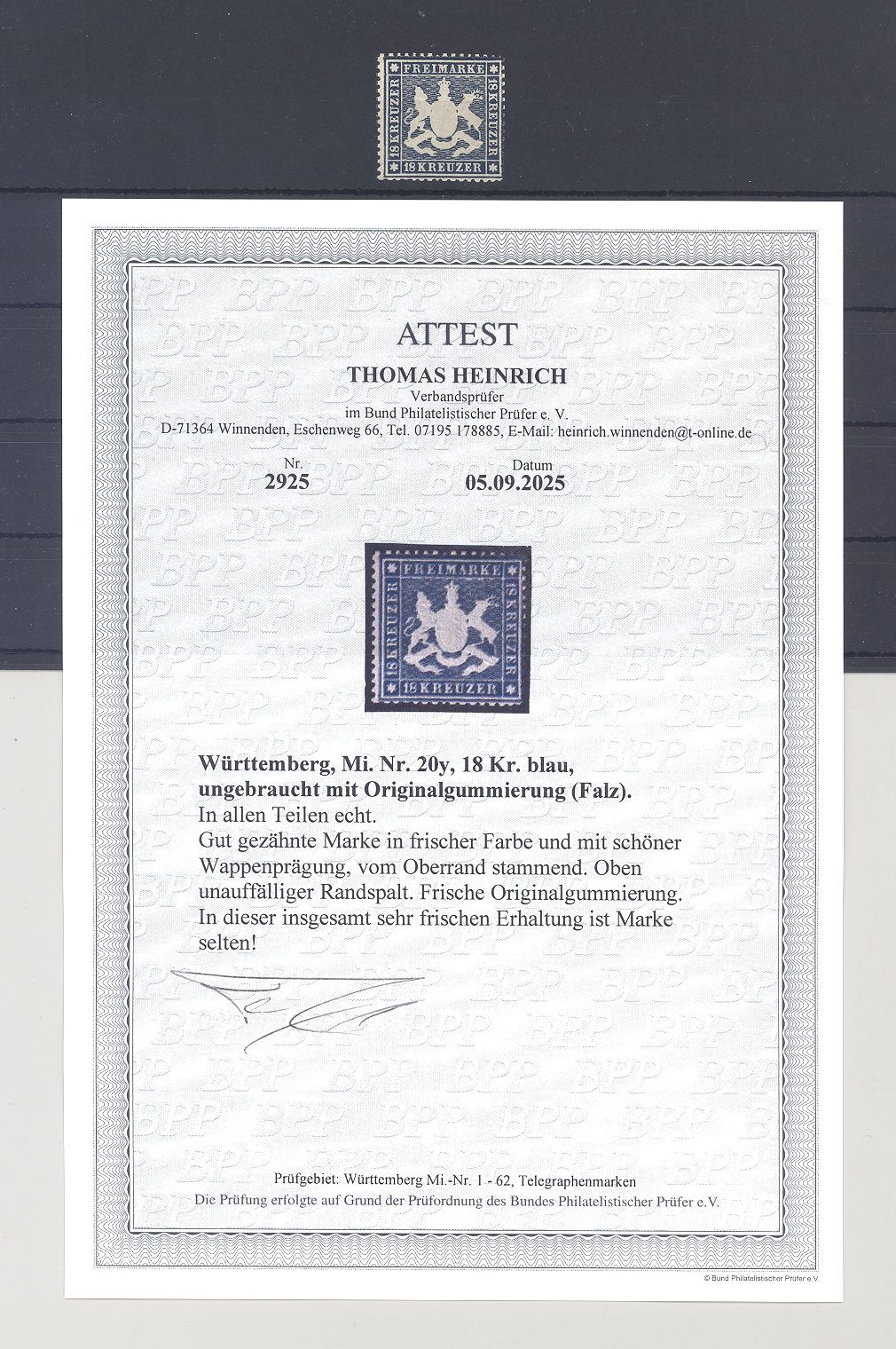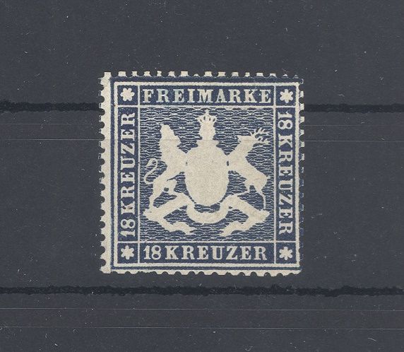 Württemberg Michel Nummer 20y, 18 Kreuzer Freimarke 1861 ungebraucht * mit einem kleinen Randspalt, sonst ein schöner und frischer Wert. Es liegt ein FA BPP vor, hat bereits einiges gekostet, ist mit eingescannt, wie auch im FA BPP angegeben selten einmal angeboten, erst recht in dieser Erhaltung!
