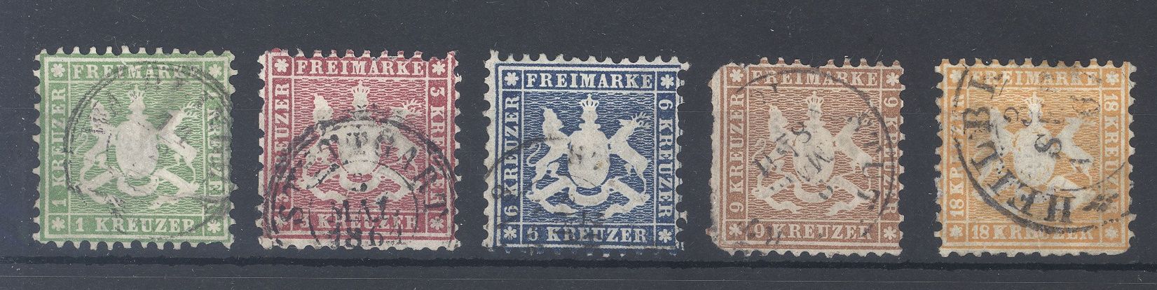 Württemberg Michel Nummer 25/29 Freimarken 1863 gestempelt in unterschiedlicher Erhaltung. Billigst…
