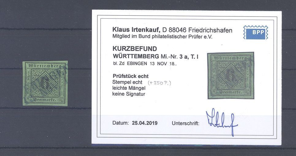 Württemberg Michel Nummer 3, 6 Kreuzer Freimarke 1851 mit sehr gutem Stempel, ein vollrandiger Wert. Es liegt ein Befund BPP vor, ist mit eingescannt, hat bereits einiges gekostet, nette Ergänzung zur Sammlung