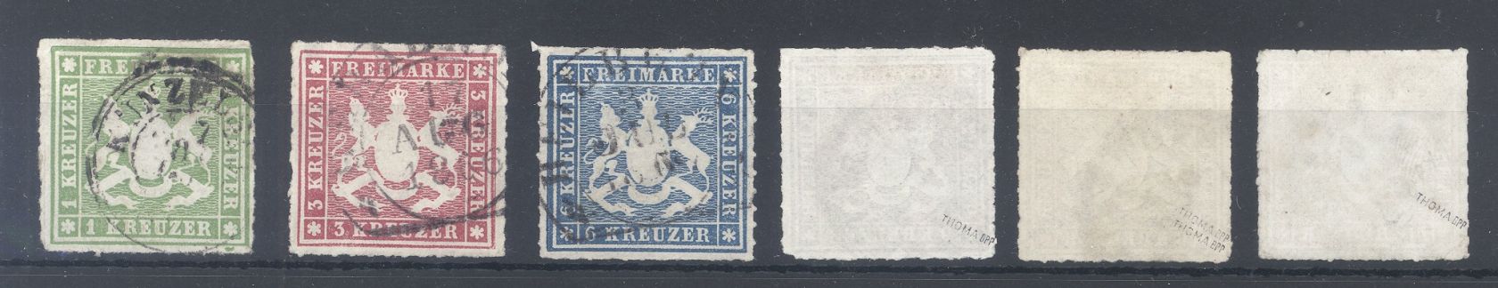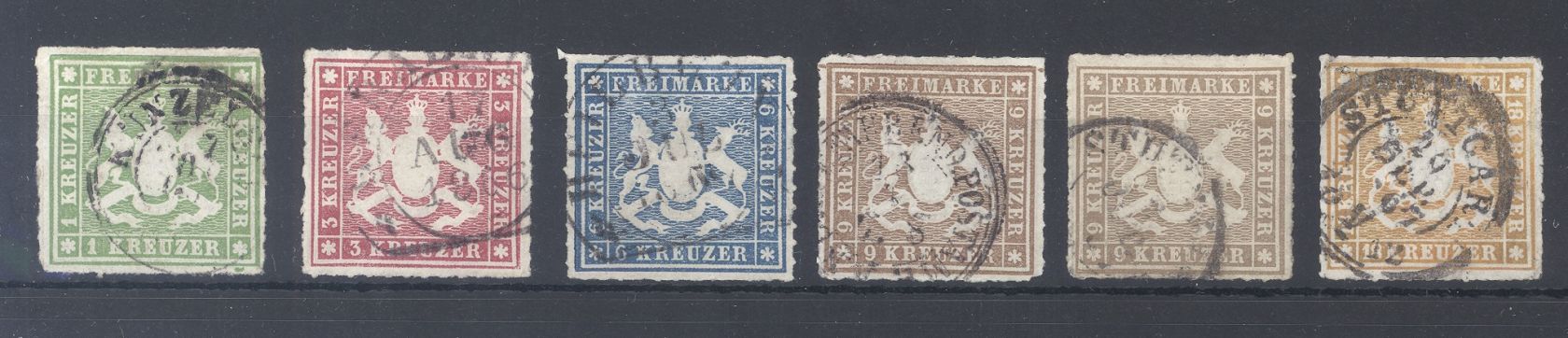 Württemberg Michel Nummer 30/34, Freimarken 1865 gestempelt, die Michel Nummer 33 ist in beiden Farben vorhanden. Drei Werte, dabei auch der Hauptwert sind geprüft.