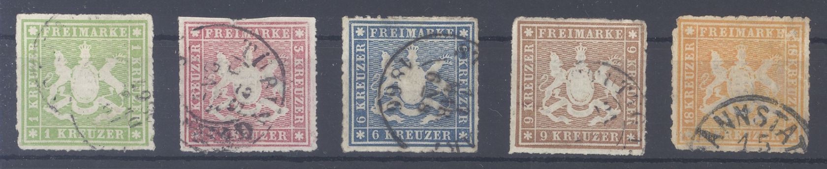 Württemberg Michel Nummer 30/34, Freimarken 1865 gestempelt in etwas unterschiedlicher Erhaltung, der Hauptwert Michel Nummer 34 ist geprüft mit Altsignatur.