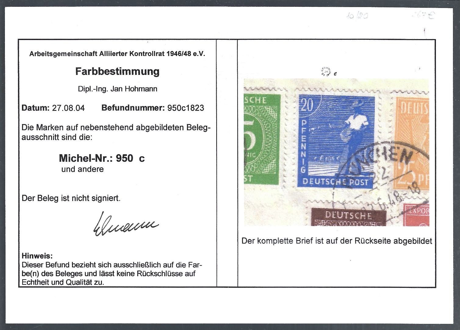 Zehfachfrankatur mit Gemeinschaftsaufgaben Mi 950 c als MiF minimal überfrankiert, fast bedeutungslos, mit Farbbestimmung Jan Hohmann