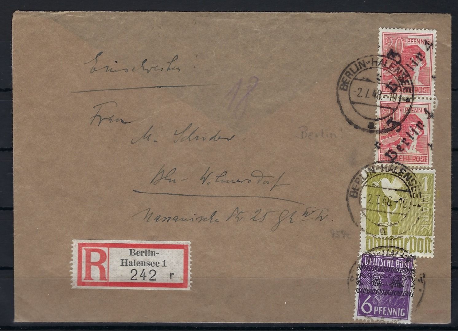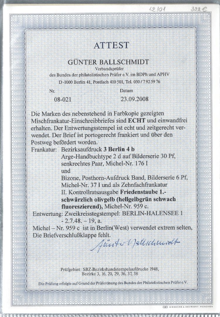 Zehfachfrankatur mit Kontrollrat Mi 959 c, SBZ Mi 176 I (2), Bizone Mi 37 I, mit FA Ballschmidt BPP, im Michel Spezial Mi 959 c auf Brief = ohne Preis