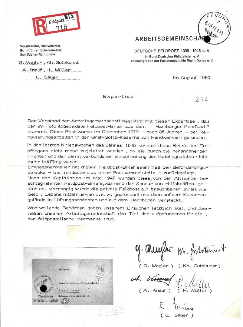 Feldpost „Hamburger Postfund“ aus Graf-Golz-Kaserne, Expertise ArGe Deutsche Feldpost