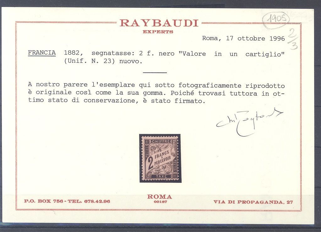Frankreich Porto Michel Nummer 22, 2 Fr. Freimarke 1881/84 ungebraucht *. Es liegt ein Befund Raybaudi vor, ist mit eingescannt.