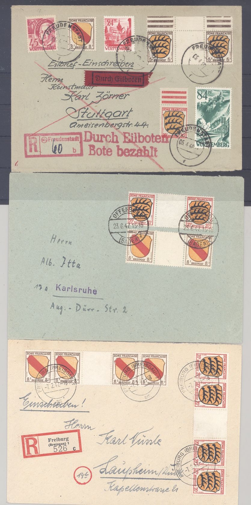 Französische Zone Allg. Ausgaben, drei dekorative Briefe frankiert mit Zwischenstegen als Posten, dabei auch ein Eilboten Brief. Nette Ergänzung zur Sammlung.