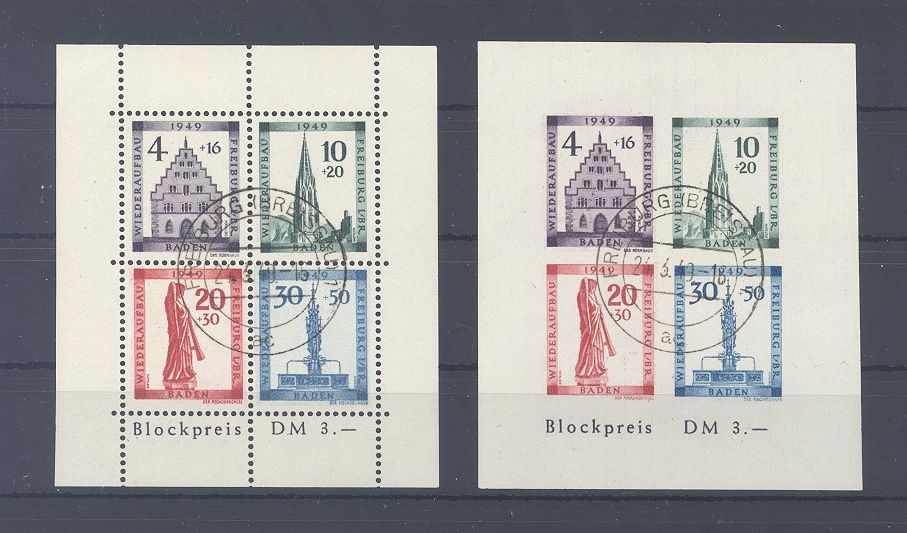Französische Zone Baden Block 1 A + B, Freiburg Blockpaar gestempelt mit Gefälligkeitsstempel Freiburg Breisgau. Beide Blöcke sind geprüft BPP.