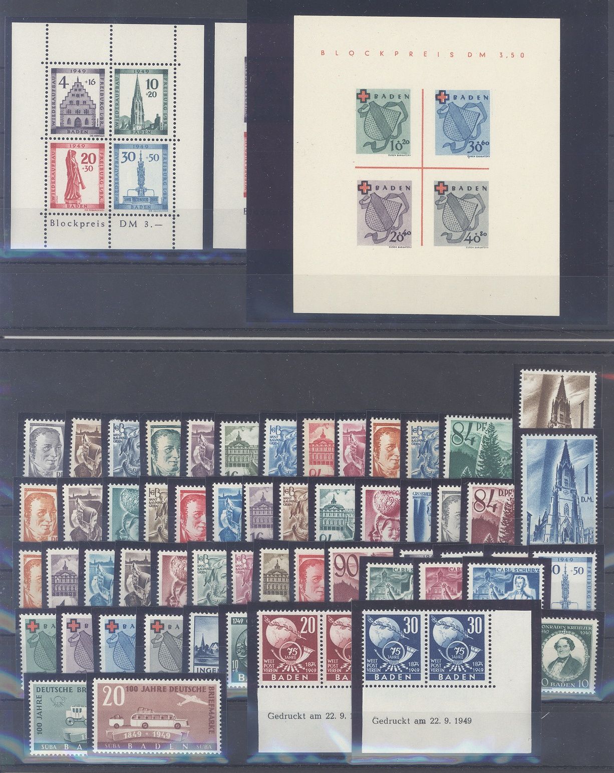 Französische Zone Baden Michel Nummer 1/57 incl. den Blöcken in den Hauptnummern komplett **. Die Michel Nummer 56/57 sind Eckrandwerte mit Druckdatum.