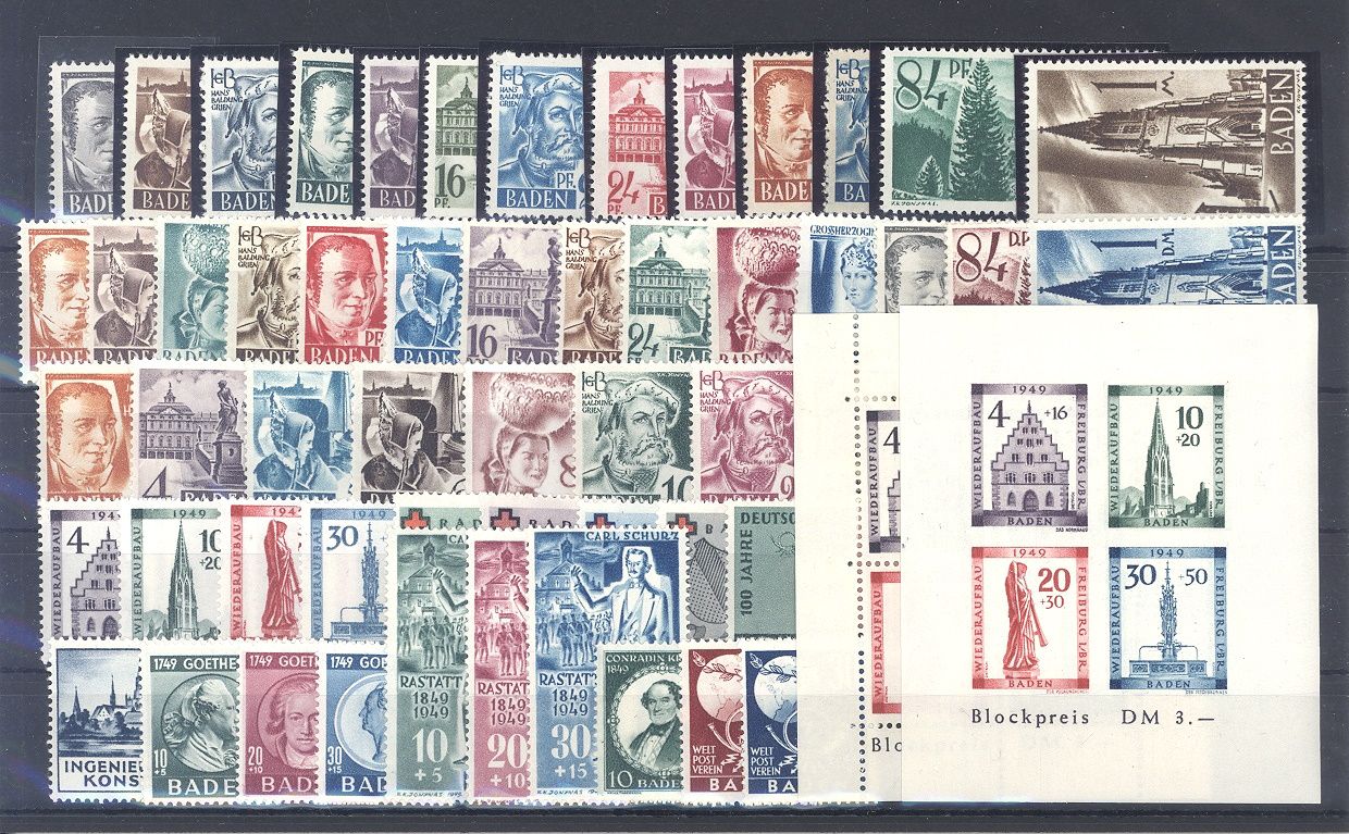 Französische Zone Baden Michel Nummer 1/57 incl. den Blöcken in den Hauptnummern komplett **. Die Michel Nummer 37 einen leichteren wohl Farbaklatsch, sonst ordentlicher Posten.