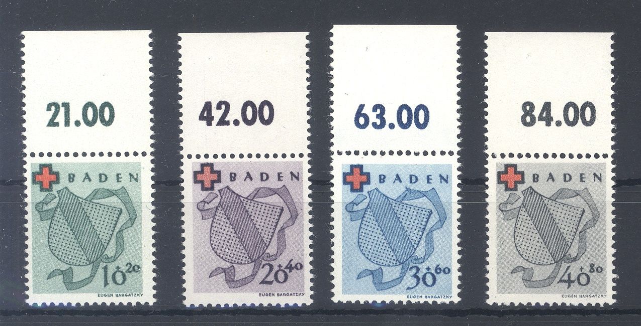 Französische Zone Baden Michel Nummer 42/45 A, Rotes Kreuz 1949 ** einheitlich vom Oberrand. Nett!
