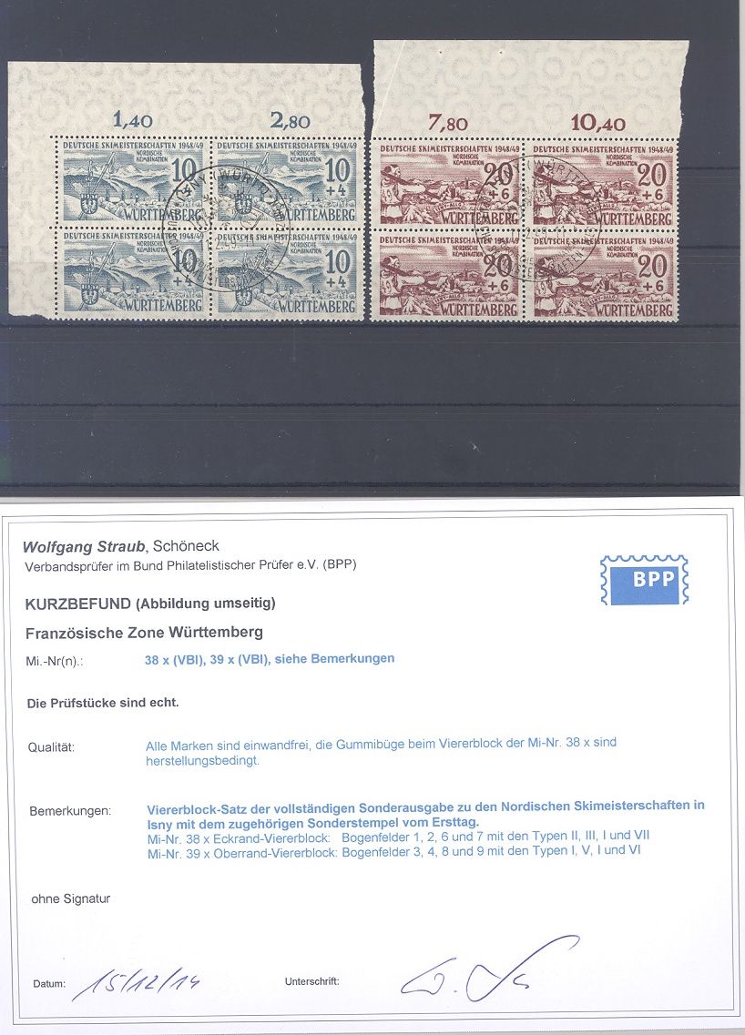 Französische Zone Württemberg Michel Nummer 38/39x, Skimeisterschaften 1949 als Viererblocksatz mit SST. Es liegt ein Befund BPP vor, hat bereits einiges gekostet, ist mit eingescannt, nette Ergänzung zur Sammlung!